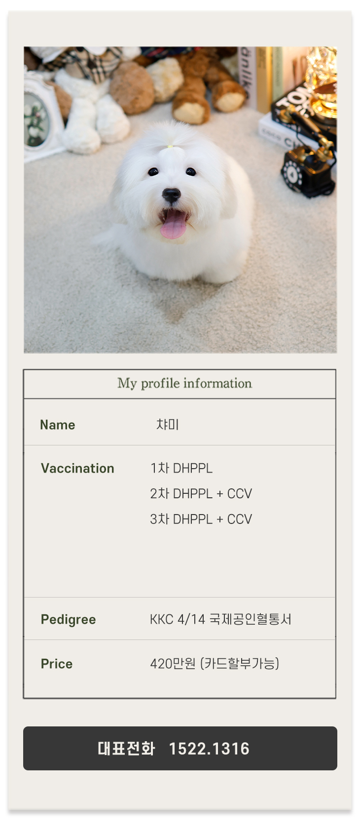 일부 타업체의 말로만 하는 건강검진이 아닌 자견, 자묘 필수 검진항목 (기본검진, 파보, 코로나, 홍역, 범백, 접종 등)을 완료 후 완벽한 컨디션이 확인 된 아가들만 분양하고 있습니다.