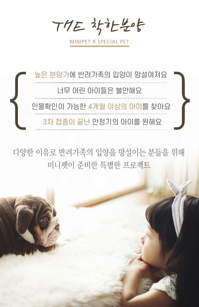 동급대비 전국 최저가 보장! 미니펫에서는 자체 병원검진과 유통마진 축소로 시중 분양가의 절반도 안되는 금액으로 건강하고 예쁜 아가를 분양하여 드립니다.